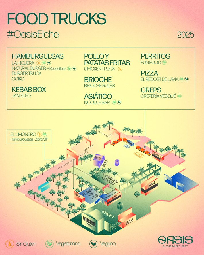 Derechos de imagen: El comprador de entradas de Oasis Elche Music Fest autoriza expresamente a Producciones Baltimore S.L. y otras personas físicas y jurídicas a ceder sus derechos de explotación sobre las imágenes o partes de las mismas, en las que aparezca, podrán utilizar esas imágenes en todos los países del mundo sin limitación geográfica de ninguna clase. Esta autorización no fija ningún límite de tiempo para su concesión ni para la explotación de las imágenes. En caso de querer revocar esta autorización, el comprador podrá escribir a hola@producciones.es